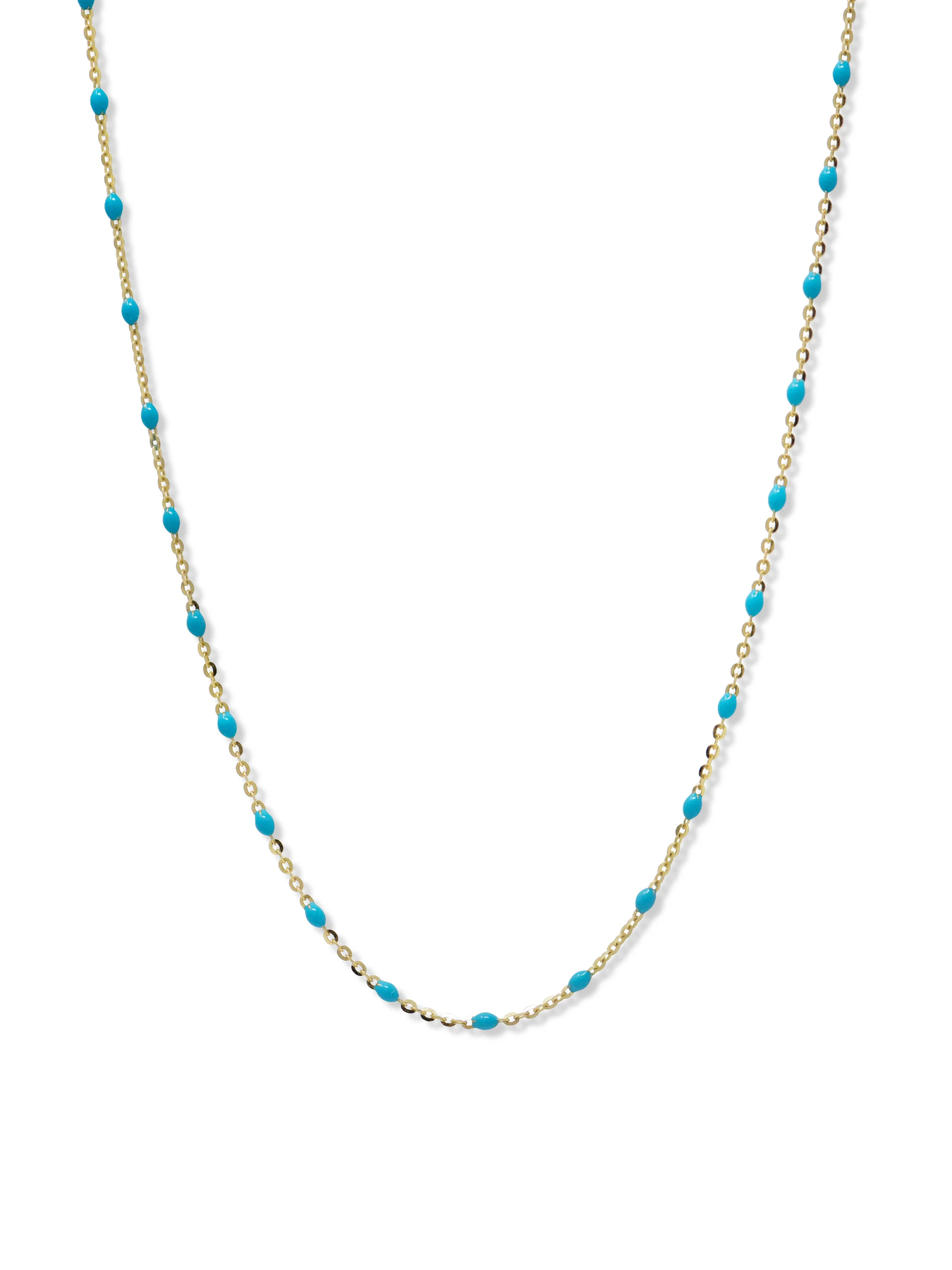 A yellow gold diamond cut chain is adorned with turquoise enamel stations connected with an elongated lobster clasp and an Anzie tag.