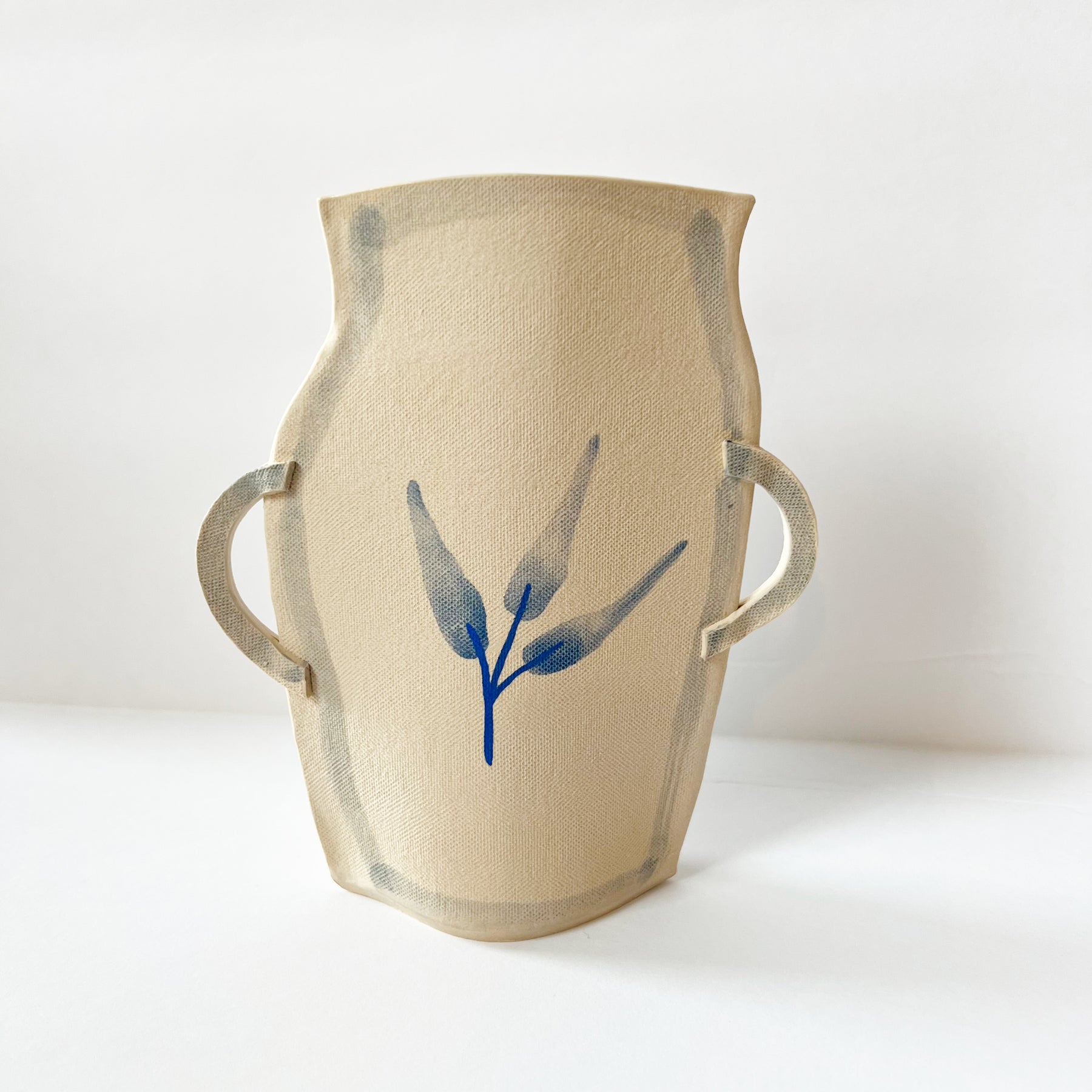 Unique Stoneware vase with clear glaze inside and underglaze decoration outside.