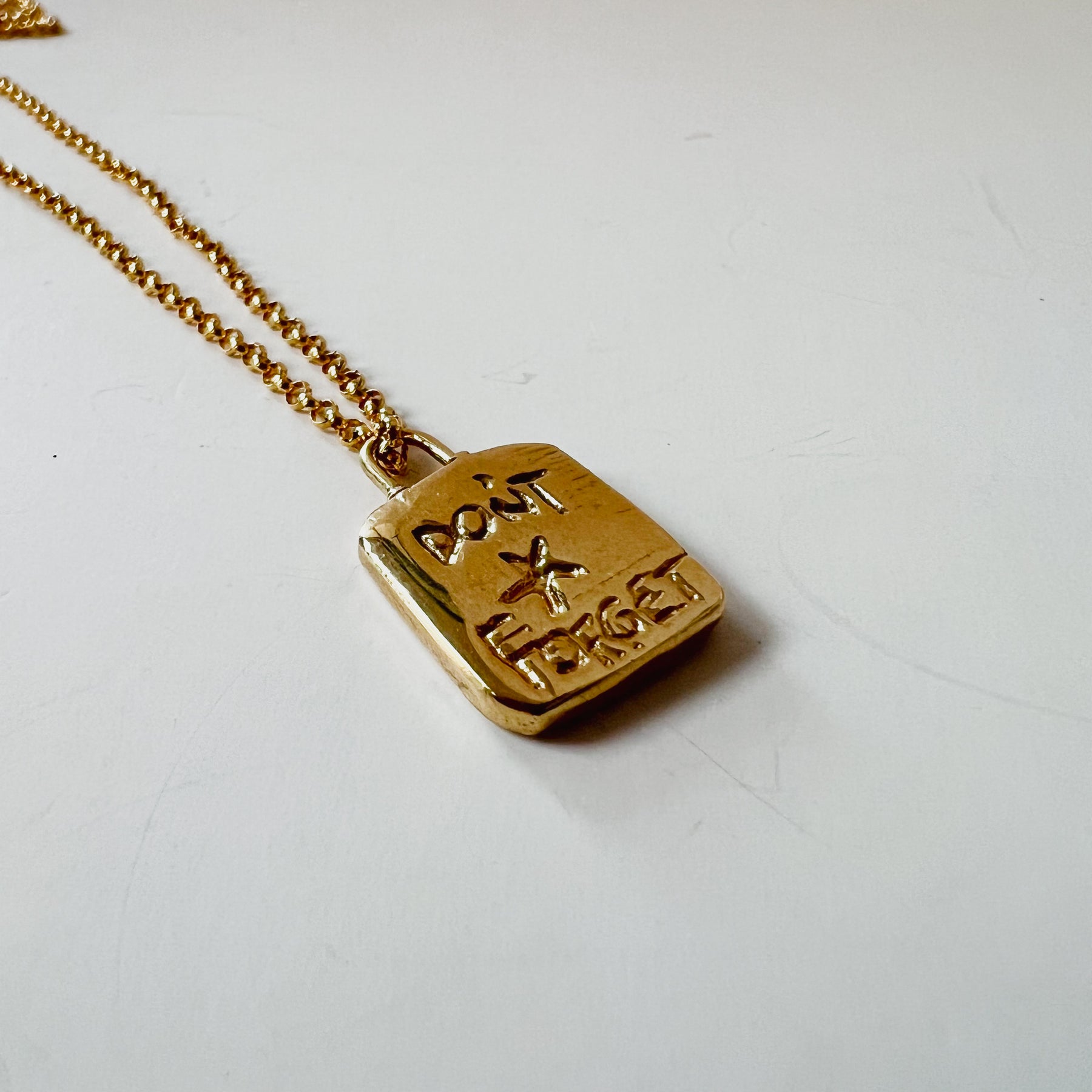 A tiny charm (1/2 an inch) hand-carved in brass on an 18” goldfilled chain. The words “don’t forget” on the back. Inspired by remembering those you love, the beautiful things in life & how far you’ve come.