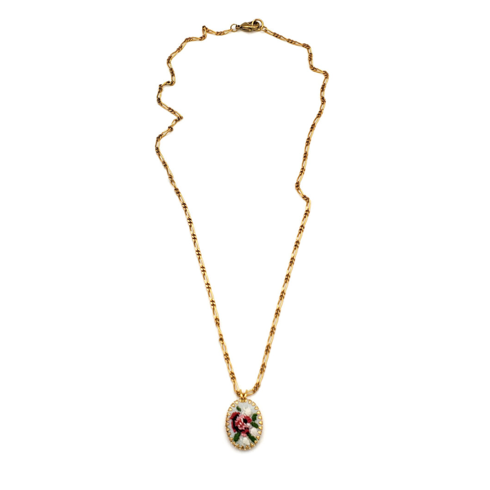 Meet your new favorite accessory—a charming necklace featuring adorable vintage-style embroidered pendants that tell their own delightful story. Strung on a warm raw brass figaro chain, this 18-inch beauty is just the right length for everyday wear. Love the length but want options? The included extender lets you adjust your vibe whenever the mood strikes. Perfect for adding a whimsical touch to any outfit.