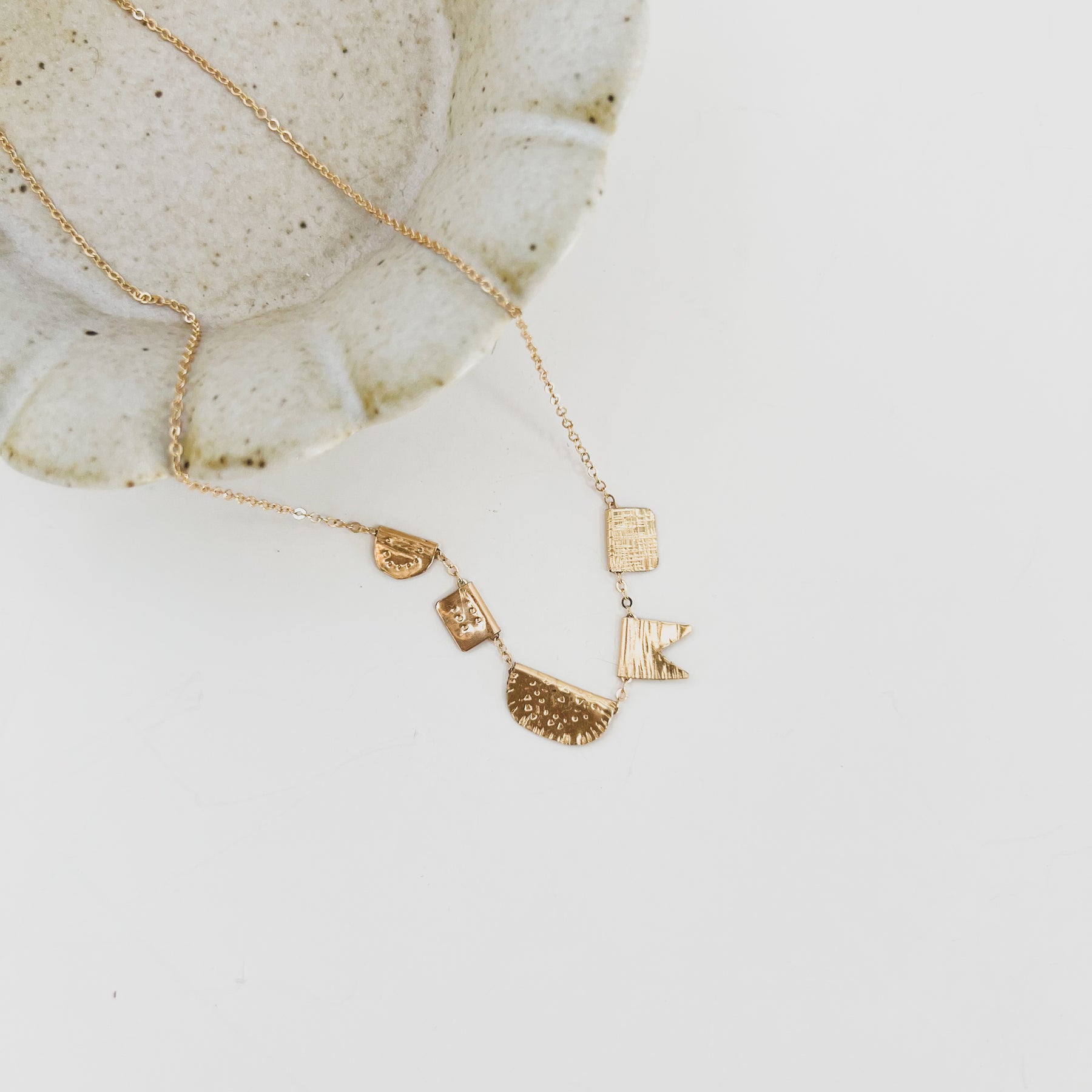 These delicate necklaces are made of fine gold-fill round cable chain and finished with hand-hammered, hand-carved 14k gold-filled accents, each one individually folded onto the chain. A little detail that catches the light just right. Lightweight, easy to layer, and subtle enough for everyday.